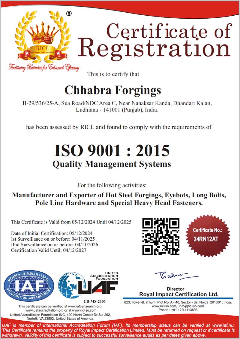 Each and every stage of manufacturing at Chhabra Forging reflects a profound presence of excellence in quality. To meet the most exacting requirements of the most demanding client, we have an array of sophisticated technology to ensure the best of quality. Quality assurance activities for the manufacture of all the products of our plants are closely coordinated at all the production stages.
